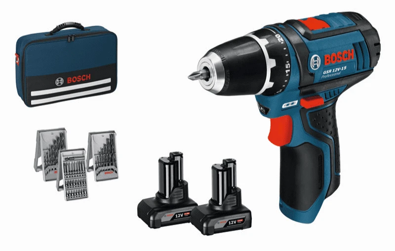 Akku-Bohrschrauber GSR 12V-15 in Tasche mit 39 teiligem Zubehör. Das kürzeste Kraftpaket seiner Klasse. Mit 169 mm kürzeste Bauform seiner Klasse für optimale Handhabung vor allem bei Bohr- und Schraubanwendungen über Kopf und an engen Stellen. Professionelle Leistung: 2-Gang-Getriebe sorgt für kraftvolle 30 Nm beim Bohren (bis 19 mm) und Schrauben (bis 7 mm). Vollwertiges 10-mm-Auto-Lock-Bohrfutter. Bosch Electronic Cell Protection (ECP): Schützt den Akku vor Überlastung, Überhitzung und Tiefentladung. Praktische Batterie-Ladezustandsanzeige mit 3 LEDs. Integriertes LED-Licht zur Beleuchtung des Arbeitsbereichs auch an dunklen Stellen. Motorbremse für präzises Arbeiten bei Serienverschraubungen. Kein Memory-Effekt: Der Akku kann unabhängig vom Ladezustand jederzeit geladen werden, ohne die Zellen zu schädigen. Schnellladegerät AL 1115 CV / GAL 1215 CV (2 609 160 158), 2 x 4,0 Ah Li-Ion (1 600 Z00 02Y), 25-teiliges Schrauberbit-Set (2 609 160 156), 7-teiliges Metallbohrer-Set (2 609 160 158), 7-teiliges Holzbohrer-Set (2 609 160 157)
