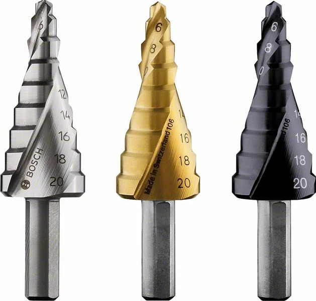 Stufenbohrer HSS-AlTiN. Stufenbohrer mit Spiralnut. 3-Flächen-Schaft. Stufenhöhe: 4 mm, Schaftdurchmesser: 6 mm, Gesamtlänge: 50 mm, 9 Stufen, Durchmesser: 4 / 6 / 8 / 10 / 12 / 14 / 16 / 18 / 20 mm. Geeignet für nahezu alle dünnen Materialien wie z. B. Nichteisenmetalle, Stahlblech, Kunststoff oder rostfreien Stahl. Ohne Vorbohren, gratfrei in dünne Bleche. Zum Entgraten. Für runde Löcher. Bohren von mehreren Durchmessern mit einem Bohrer. Aufbohren von bestehenden Löchern. Spiralnut für längere Lebensdauer. Weniger Vibrationen und schnelleren Bohrfortschritt. Durchmessermarkierung in beiden Spiralen. 3-Flächen-Schaft gegen Durchrutschen im Bohrfutter.